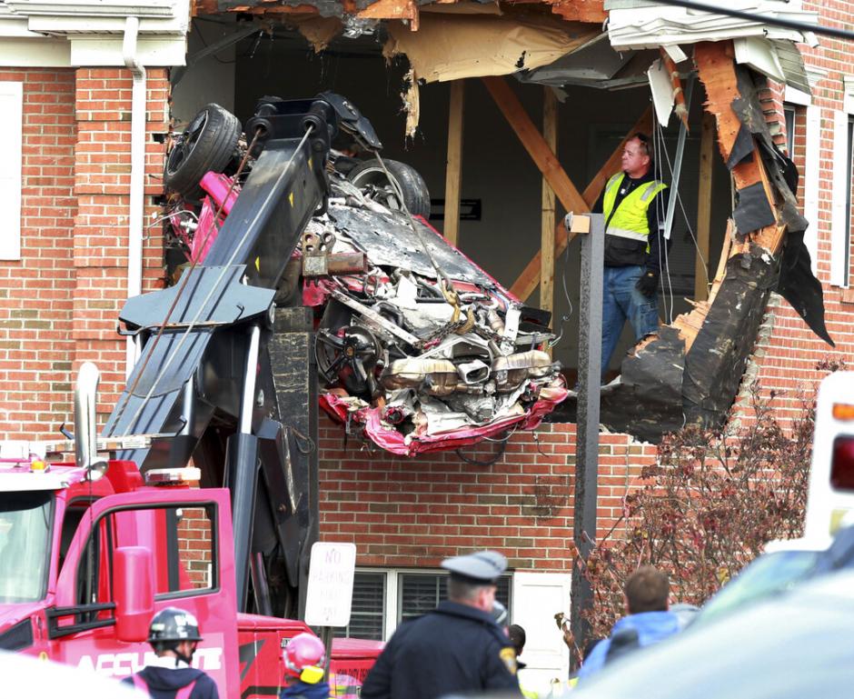Toms River police say the red Porsche Boxster went out of control just after 6:30 a.m. Sunday. The car hit the center median, struck an embankment and went airborne into the building.
