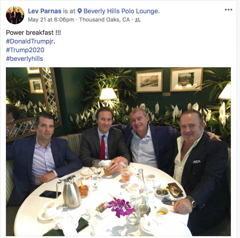 This Facebook screen shot provided by The Campaign Legal Center shows, from left, Donald Trump Jr., Tommy Hicks Jr., Lev Parnas and Igor Fruman, posted on May 21, 2018. Parnas and Fruman were arrested on Thursday, Oct. 10, 2019, on campaign finance violations resulting from a donation to a political action committee supporting President Donald Trump's reelection. (The Campaign Legal Center via AP)