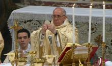 In this image made from video provided by CTV, Pope Francis, right, celebrates his inaugural Mass with cardinals inside the Sistine Chapel, at the Vatican, Thursday, March 14, 2013. As the 266th pope, Francis inherits a Catholic church in turmoil, beset by the clerical sex abuse scandal, internal divisions and dwindling numbers in parts of the world where Christianity had been strong for centuries. (AP Photo/CTV)