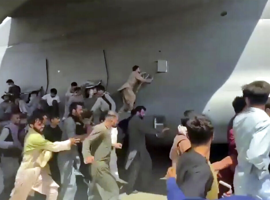 As the U.S. military and others continued evacuation flights, Afghans swarmed over the international airport's tarmac. Some climbed into aircraft parked on the taxiway, while others dangled precariously off a jet bridge.