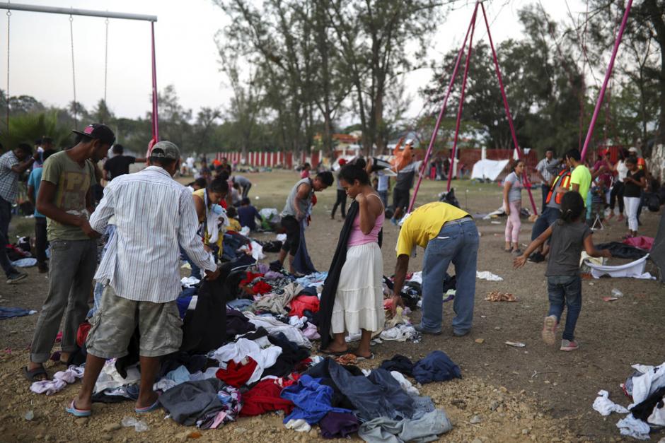 On Monday, the mass of mostly Hondurans that had been walking along roadsides and train tracks stopped in Oaxaca state at the field, where they are getting advice on filing for transit or humanitarian visas in Mexico. Many took refuge from the hot afternoon sun by resting in the stands under the awning. As night fell, the migrants, many with children, lit fires to cook their meager rations.