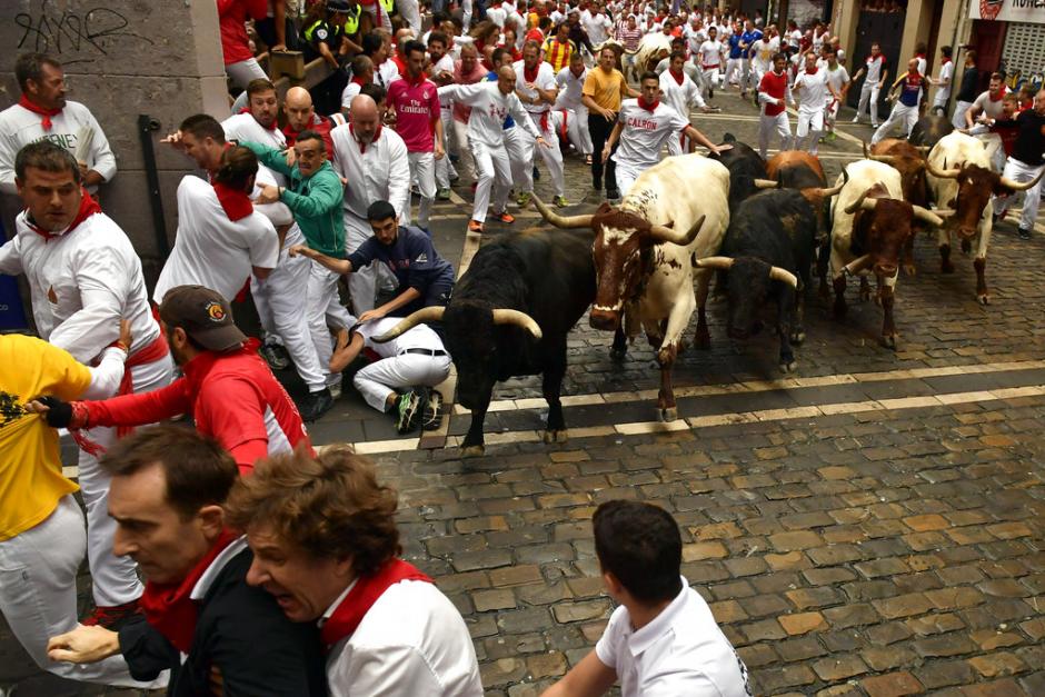 Television images showed one bull running into a man from behind and hooking a horn into his jacket as he fell to the ground.