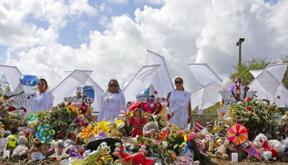 The students were greeted by 17 people dressed in white costumes as angels standing beside a makeshift memorial outside the school. Organizer Terry Decarlo said the costumes are sent to every mass shooting and disaster so the survivors "know angels are looking over them and protecting them." Many of those dressed as angels at Stoneman Douglas on Sunday were survivors of the 2016 mass shooting at the Orlando nightclub Pulse, where 49 people died.