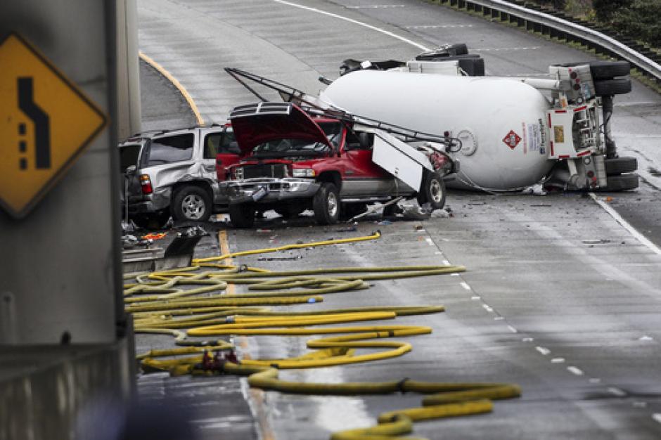 A tanker truck carrying propane rolled over on Seattle's Interstate 5 on Monday morning, shutting area roads for about eight hours amid concerns about a hazardous materials spill.