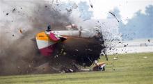 A stunt plane crashes during a wing walker's performance at the Vectren Air Show, Saturday, June 22, 2013, in Dayton, Ohio. The crash killed the pilot and the wing walker instantly, authorities said. (AP Photo/Thanh V Tran)