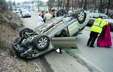 The driver of this Subaru, Mary Ann Cegielsky, hit the embankment along Lightstreet Road near Hospital Drive sending it onto its roof Tuesday afternoon in Bloomsburg. (Photo by Keith Haupt - Press Enterprise)
