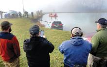 A crowd gathered Wednesday morning along Sunbury Road in Rush Township as rescue crews and a tow truck driver worked to pull this SUV from a pond. The crash happened overnight, but calls to the 911 center in the early morning hours sent fire and rescue crews to the scene.