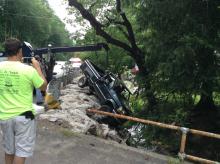 NESCOPECK — A large section of a modular home slid off its trailer Monday morning and hit two vehicles...