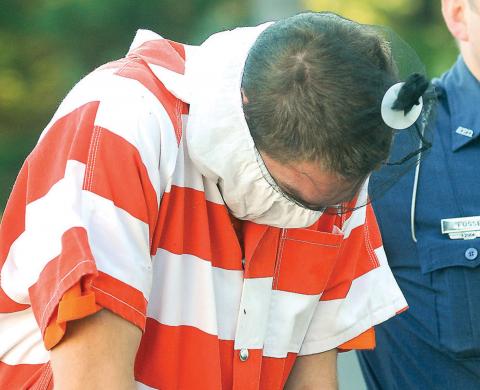 Paul Edward Williams is taken into District Judge Lawton's court Wednesday with a spit hood after he allegedly spat on guards at the Columbia County prison. Williams is accused of knocking down a woman while she held a one-month-old baby over the weekend.