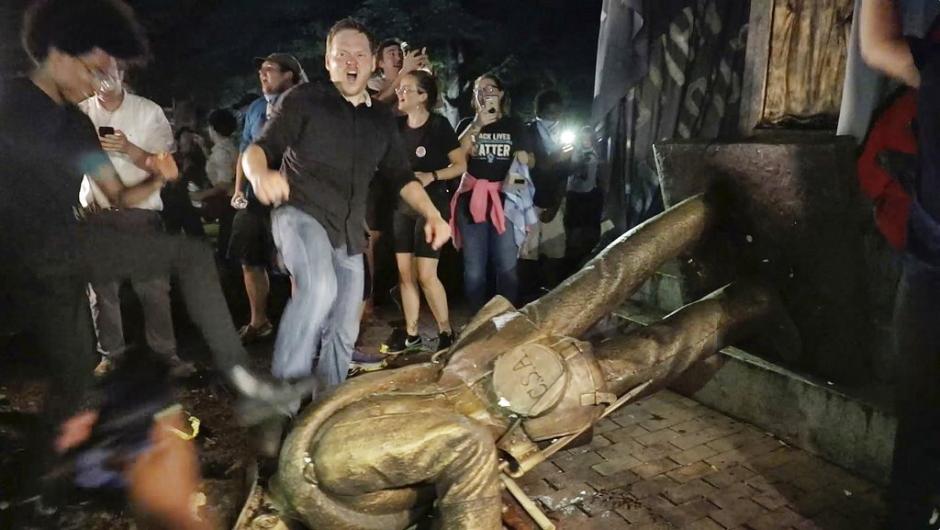 CHAPEL HILL, N.C. (AP) — A Confederate statue in the heart of North Carolina's flagship university was toppled Monday night during a rally by hundreds of protesters who decried the memorial known as "Silent Sam" as a symbol of racist heritage.