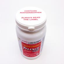 This undated product image provided by Johnson & Johnson shows a bottle of Extra Strength Tylenol bearing a new warning label on the cap alerting users to potentially fatal risks of taking too much of the pain reliever. Johnson & Johnson, the company that makes Tylenol, says the warning will appear on the cap of new bottles of Extra Strength Tylenol sold in the U.S. starting in October 2013 and on most other Tylenol bottles in coming months. (AP Photo/Johnson & Johnson)