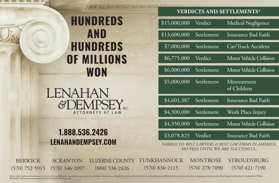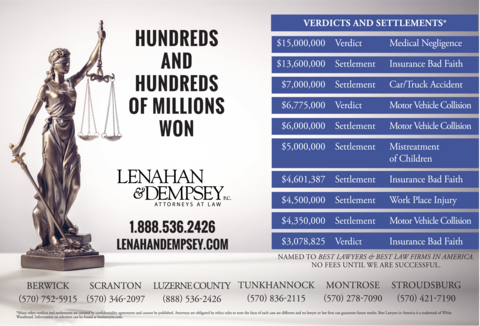 If you or a loved one has suffered a serious injury of any kind, or been injured due to negligence, or if you have had an insurance company ignore, or deny your claim, or made a low offer to settle you should call the Scranton personal injury lawyers at Lenahan & Dempsey immediately