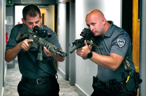 Salem Township Police Sgt. Tom Hegland, left, and Officer Joshua Switzer prepare to enter a room with an active shooter during training at the Township building Sunday